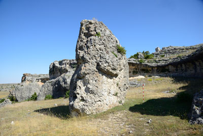 Cerca de las provincias de Soria y Segovia, Campisábalos es un lugar de páramos extensos con una amplia dehesa en la que aún pasta el ganado vacuno extensivo. Al pie de un roquedo hay una curiosa piedra que parece desprendida del cantil, o mejor aún, formando un relieve residual del mismo. Sin embargo, los geólogos han descubierto que la estratificación no se corresponde con la pared cercana, es decir, que parece hincado a propósito en vertical. Es difícil imaginarse una función simbólica, ritual, funeraria o de cualquier otro tipo, pero aquí queda el llamado menhir de Campisábalos. Coordenadas ETRS89: x0487638 y4567222.